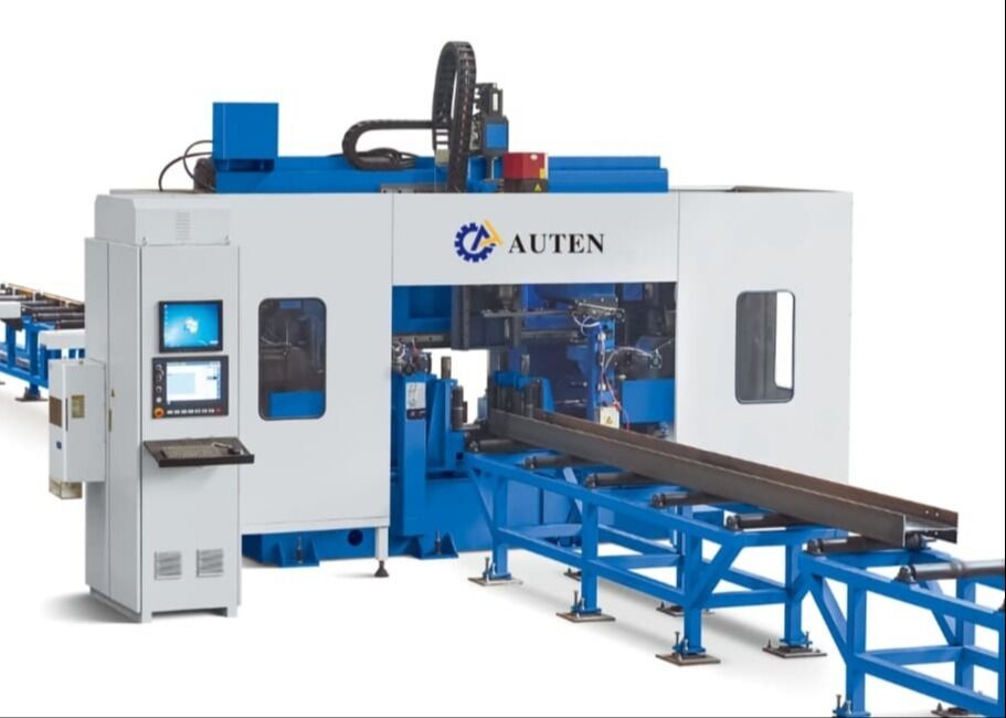 This machine is primarily designed for drilling H-beams, channel steel, and box beams, and is widely utilized in industries such as steel fabrication, construction, bridge manufacturing, three-dimensional parking structures, and more. The 7-axis CNC section steel 3D drilling machine utilizes seven servo motors to achieve precise positioning in two vertical axes, one horizontal axis, and one longitudinal axis, along with servo-driven feeding for the three spindles. The machine is equipped with three drilling surfaces, each featuring a dedicated drilling spindle. Each spindle is powered by a frequency-controlled motor, with servo-controlled feeding for optimal performance. Capable of processing holes with a diameter of 1, the machine drills all three sides of the workpiece in a single operation, ensuring high efficiency and accurate hole placement. This machine plays a crucial role in upholding quality standards within the steel fabrication and manufacturing sectors.
